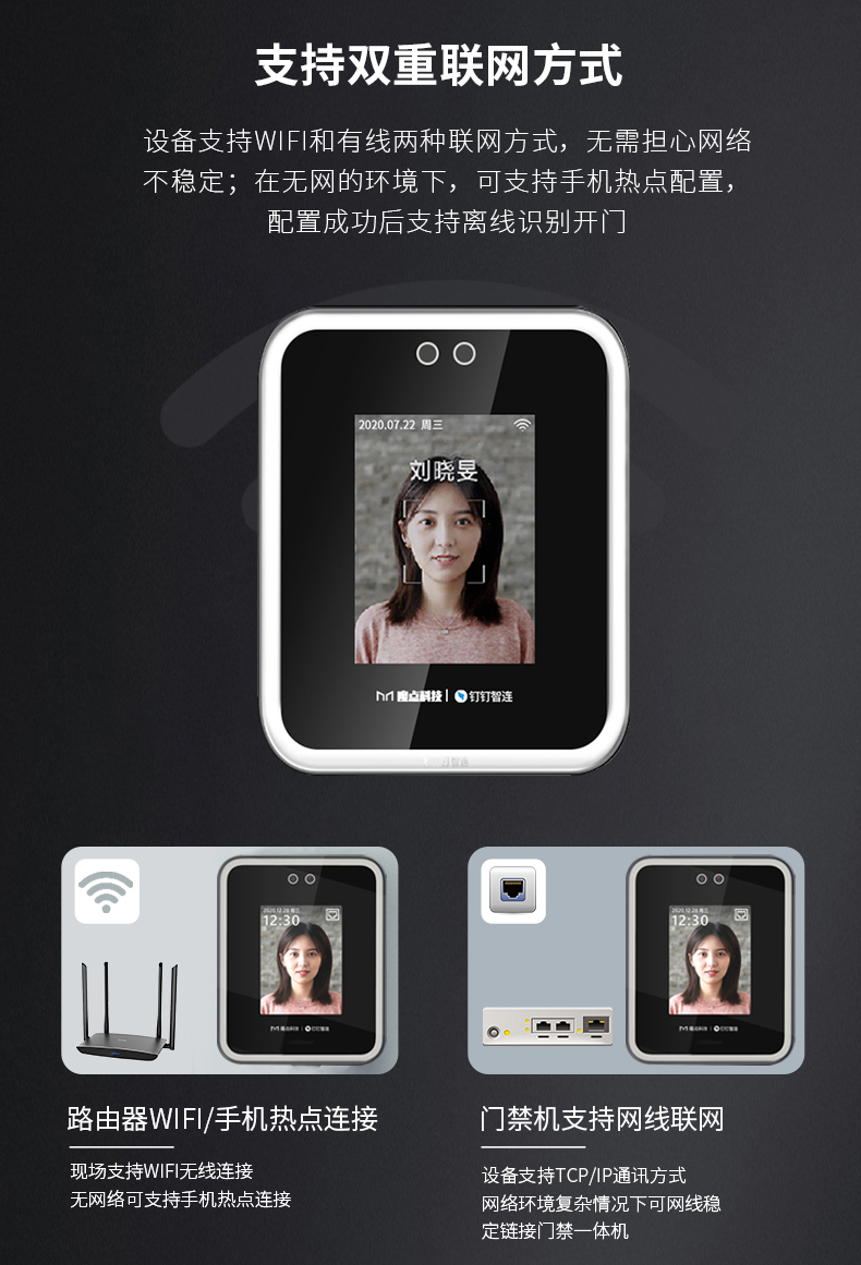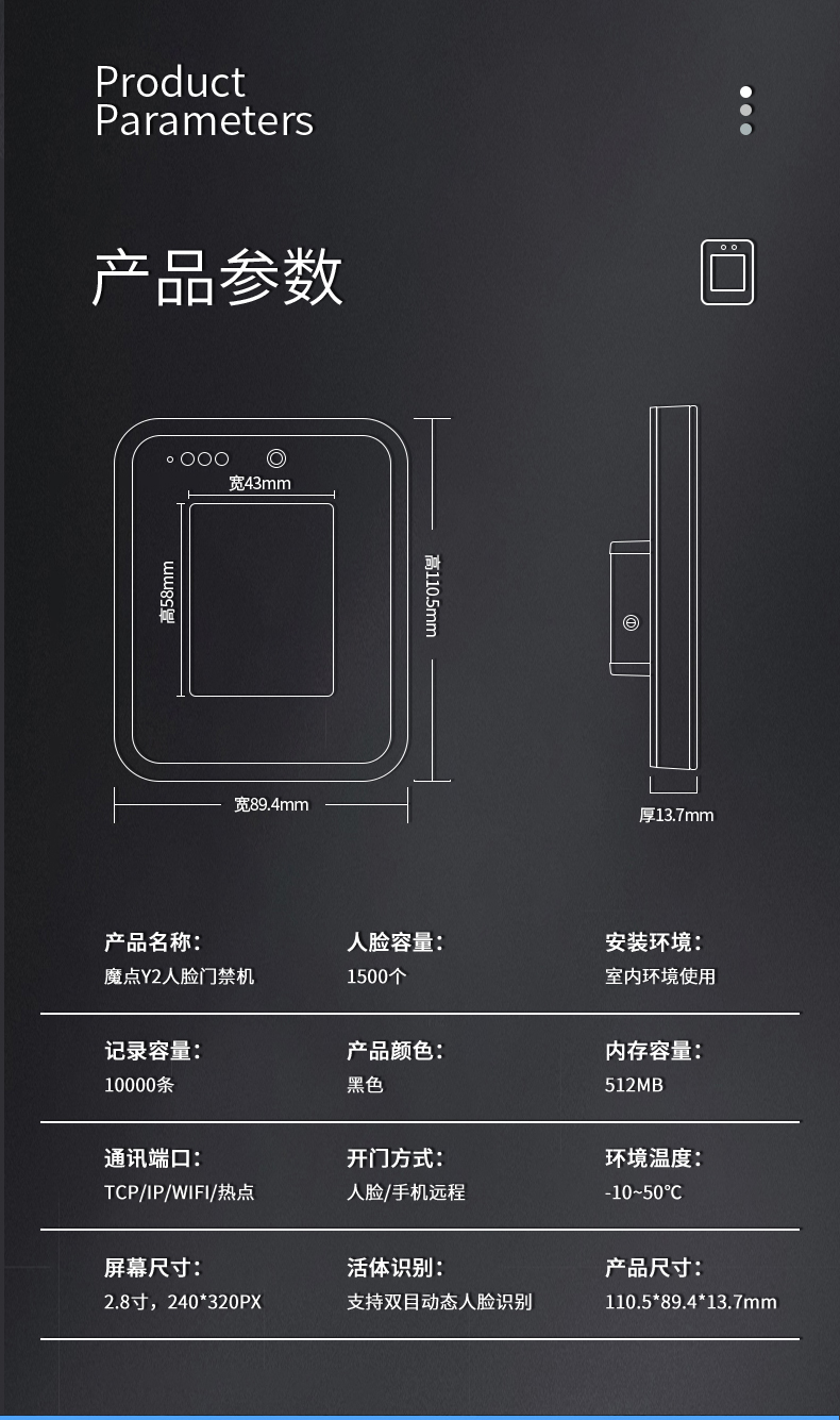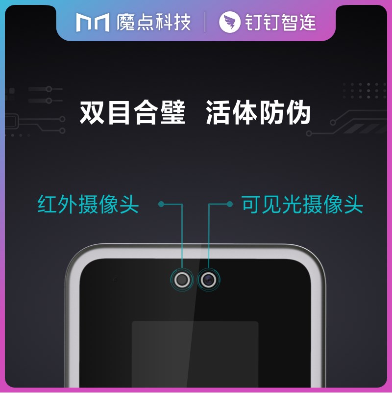 魔點Y2智能人臉考勤門禁搭載海思處理器和智能雙攝,配2.8寸觸摸屏,識別速度僅0.3秒,離線支持1500張人臉容量。 雙目合璧 活體防偽 采用混合光譜技術,活體防偽,抵御圖像攻擊 突破地域限制 跨區域考勤數據云端實時同步 考勤數據一鍵生成,手機可查,輕松便捷 出差,遲到、缺卡,各種出勤狀況清晰匯總 擺脫空間束縛 支持多場景安裝 玲瓏身材,支持玻璃、大理石、乳膠漆等多種墻面安裝,適配更多樣,使用更便捷
